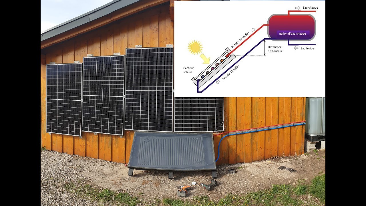 Le chauffe-eau solaire thermosiphon est composé d'un ou plusieurs capteurs solaires et d'un ballon d'eau chaude positionné à l'horizontale, au-dessus des capteurs, sur la toiture. Le système thermosiphon n'a pas besoin de régulation, ni de pompe. La circulation de l'eau s'effectue seule, par phénomène de thermosiphon : l.