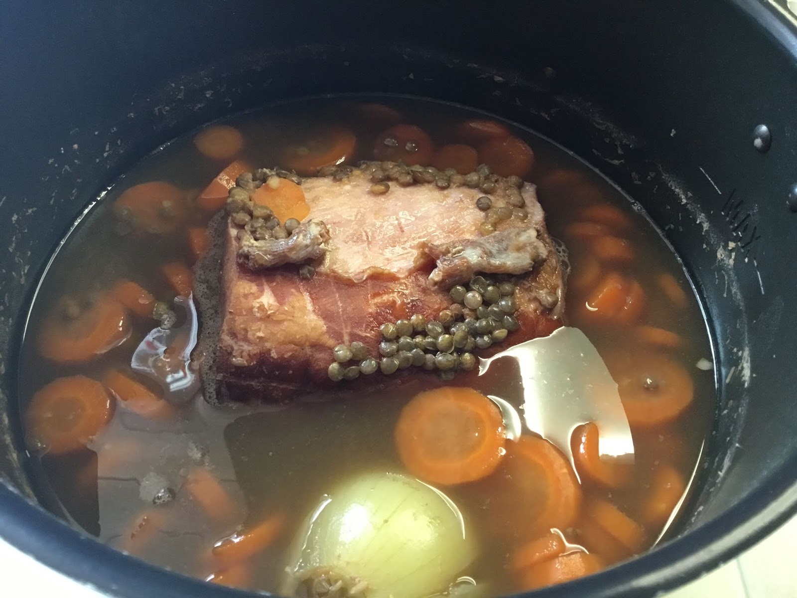 Insérer la sonde au milieu de la pièce de viande. Régler l'alarme à 68°. Enfourner jusqu'à ce que l'alarme sonne, ce qui veut dire que la température à cœur est de 68°, et que le kassler est cuit. Cela a pris environ 3h30 pour ma pièce de 570 g. Si votre kassler doit encore patienter au four avant dégustation, baissez le four à 65°.