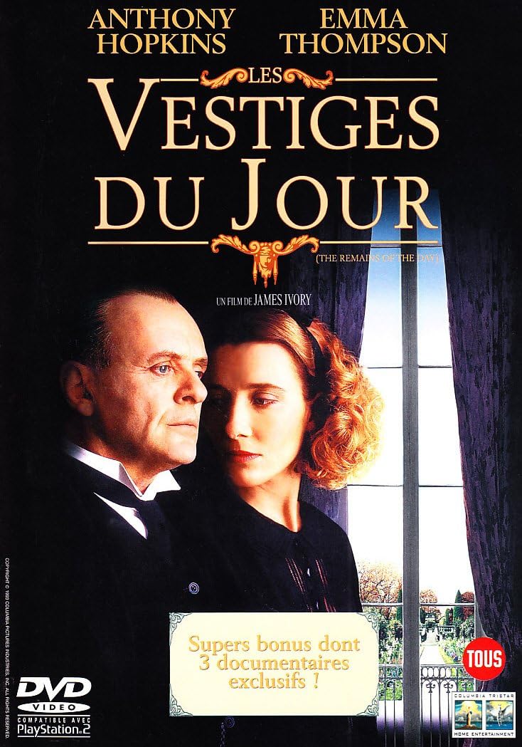 Les Vestiges du jour. Les doutes et les tourments du majordome d'une grande famille anglaise qui, en 1956, après trente années de parfait service, se demande s'il n'a pas gaspillé sa vie. Les Vestiges du jour, film de James Ivory avec Anthony Hopkins, Emma Thompson, James Fox.