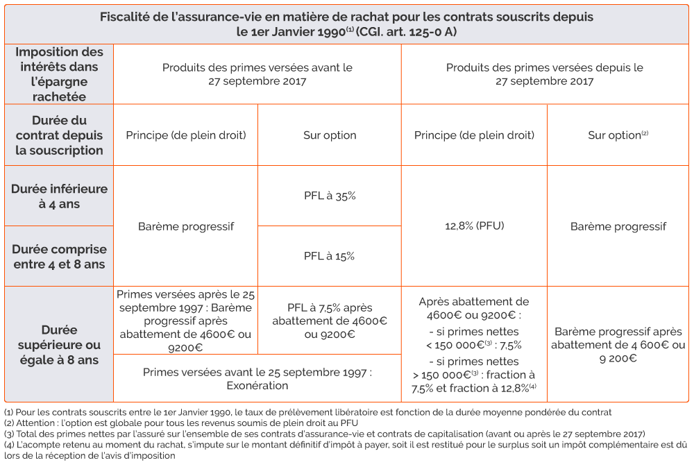 La fiscalité de l'assurance-vie. La fiscalité de l'assurance-vie est différente selon les contrats et selon les conditions de sortie. Ainsi, les bénéficiaires de contrats liquidés au moment du décès bénéficient d'une exonération de droits de succession dans les conditions précisées par la documentation fiscale BOI-ENR-DMTG-10-10-20-20.. Le régime fiscal de l'assurance vie.