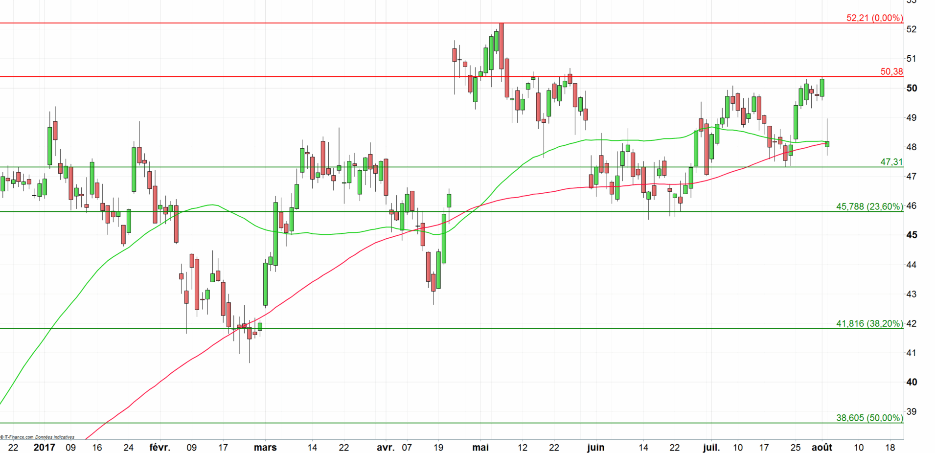 Les cours historique de l'action Société Générale peuvent être visualisées dans des intervalles de temps journalier, hebdomadaire ou mensuelle. Au bas du tableau, vous trouverez le résumé des données historiques et evolution de l'action Societe Generale SA pour la période sélectionnée. Ouv.