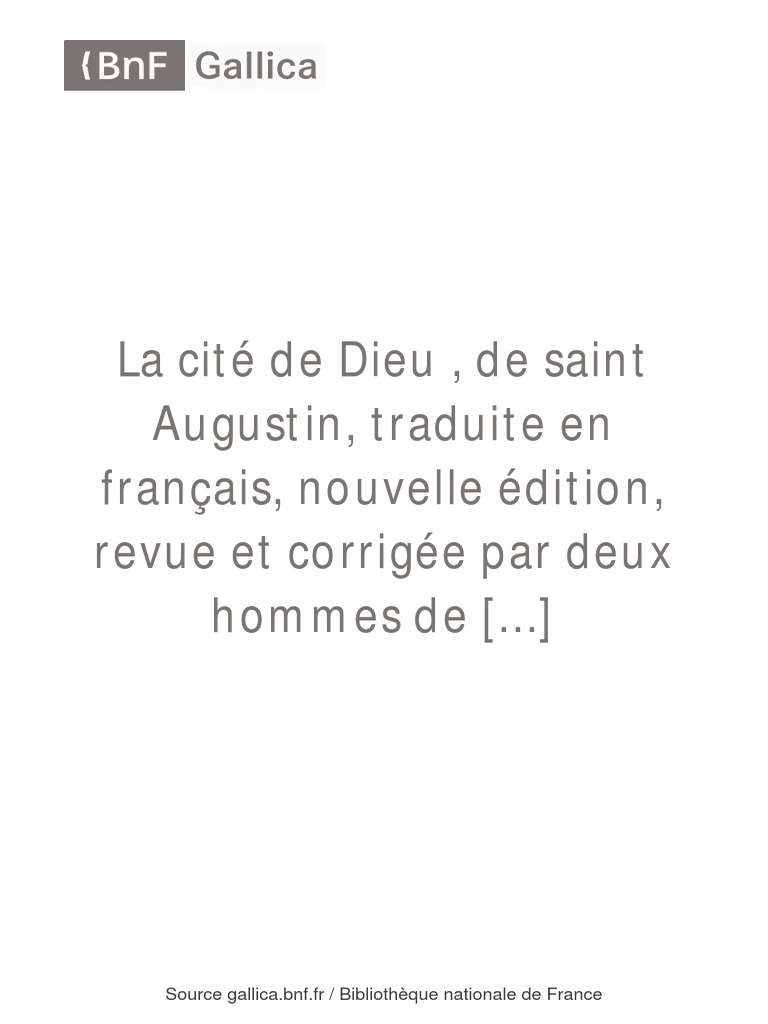 La cité de Dieu de Saint Augustin: traduction nouvelle Bookreader Item Preview. Augustine, Augustin saint, Louis Ignace Moreau. Publication date 1843 Publisher Charpentier Collection americana Book from the collections of New York Public Library Language French Volume 25