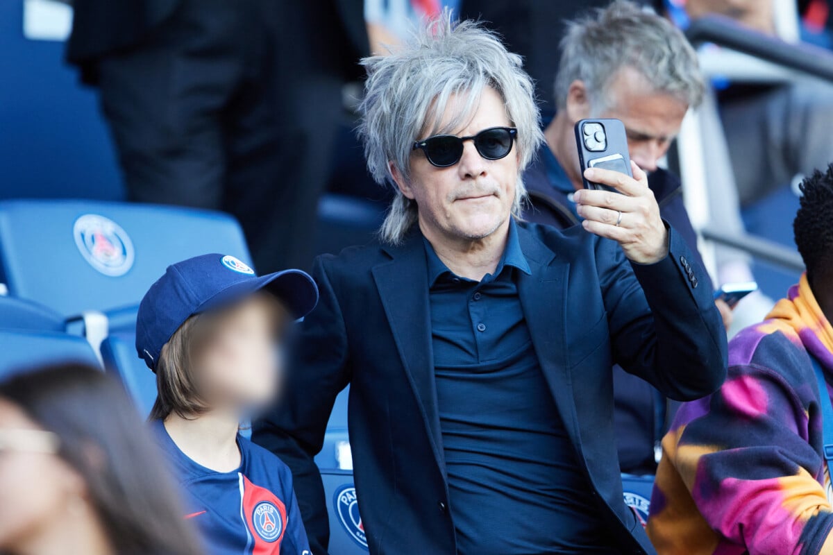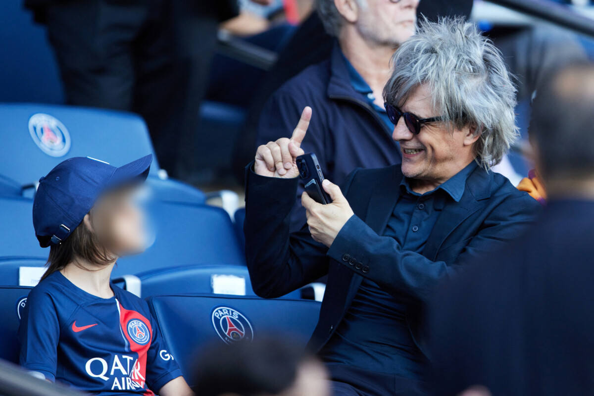 Nicola Sirkis et son fils Jules en tribunes lors du match de football Ligue 1 Uber Eats opposant le Paris Saint-Germain (PSG) au Clermont Foot 63 au Parc des Princes à Paris, France, le 3 juin 2023.