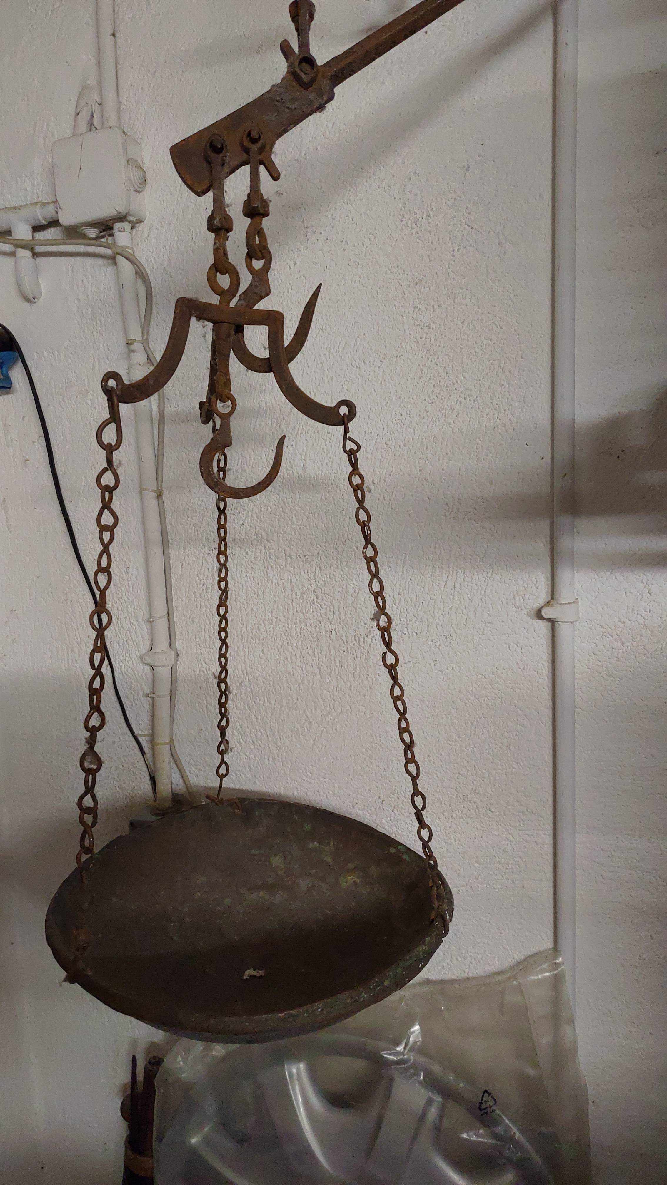 Ancienne balance romaine d'officine en fer et deux suspensions plateaux en cuivre Catawiki