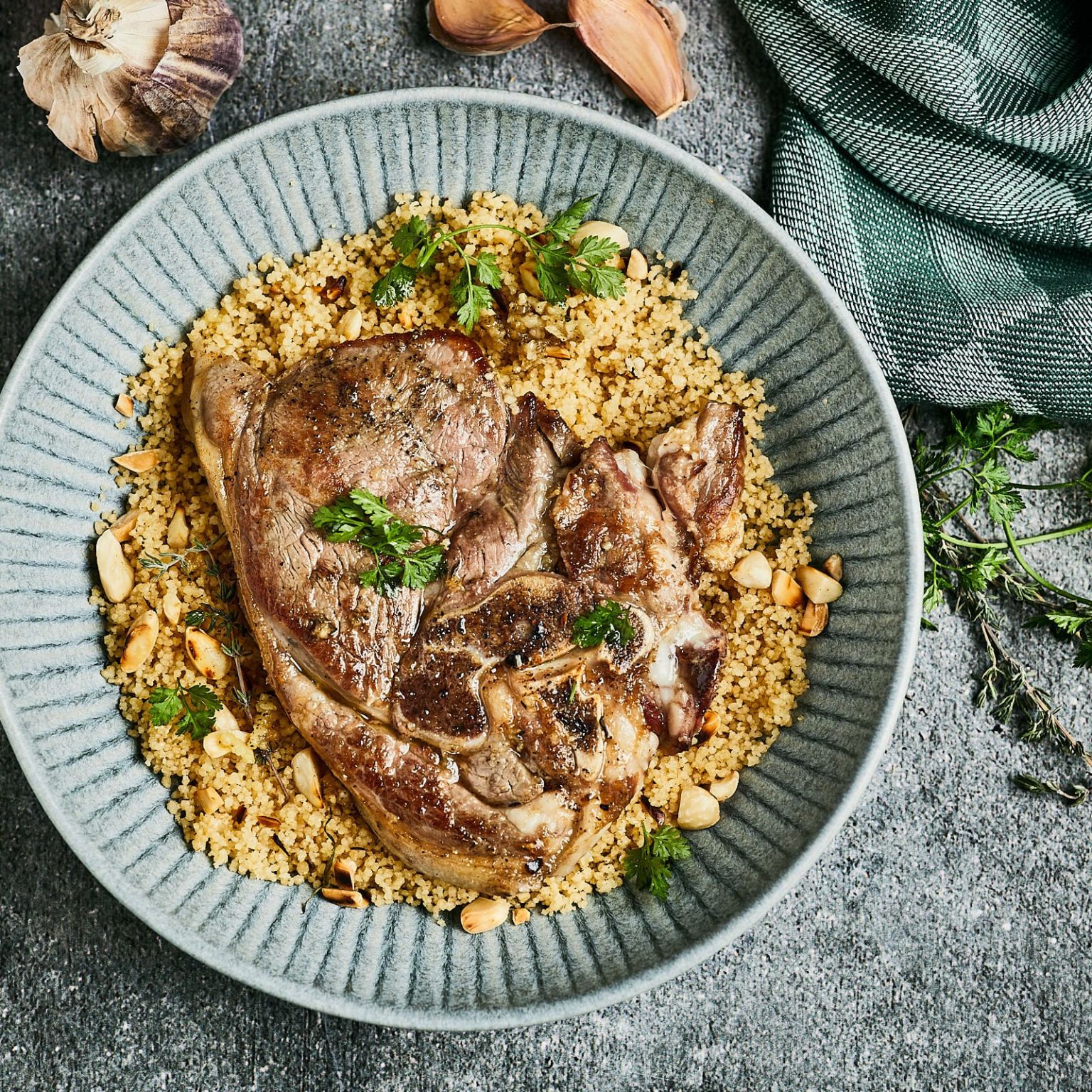 Tranches de gigot d’agneau rôtie à l’ail, au thym et au miel, semoule à la fleur d’oranger J